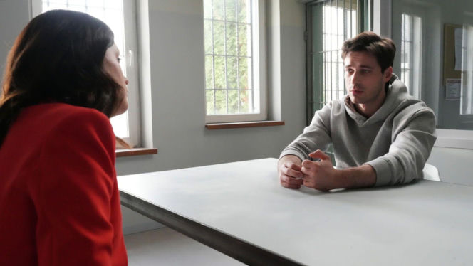 Natalia (Maria Dejmek) w czerwonej marynarce i biało-szarym topie siedzi przy stole naprzeciwko Cezarego (Marcel Opaliński) w szarej bluzie z kapturem, gestykulując rękami podczas rozmowy w pokoju widzeń. W tle, pod oknami z kratami, stoi strażnik. Więcej o ich losach na Super Seriale.