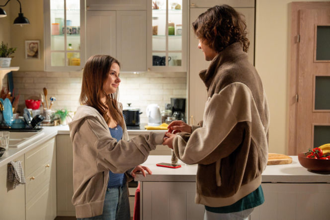 Ewa (Gabriela Ziembicka) i Romeo (Jacek Tyszkiewicz) w kuchni, on zakłada jej pierścionek zaręczynowy na palec. Romantyczne chwile bohaterów serialu "Barwy szczęścia", o których przeczytasz więcej na Super Seriale.