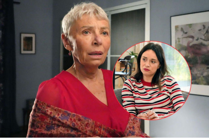 Krystyna (Hanna Bieluszko) w czerwonej bluzce i chustce na tle szarej ściany, z wyrazem zaskoczenia. Obok, w okrągłej wstawce, Maria Dejmek jako Zwoleńska, siedząca z niezadowoloną miną, w biało-czerwono-czarnej bluzce w paski. Zdjęcie ilustruje scenę zazdrości z serialu "Barwy szczęścia", o której więcej dowiesz się na Super Seriale.