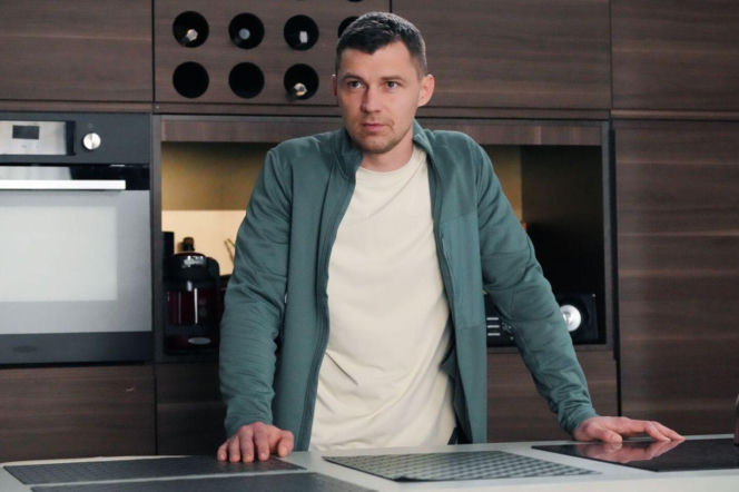 Mężczyzna w zielonej bluzie i jasnym T-shircie, Darek (Andrzej Niemyt), stoi w kuchni, opierając się o blat, z zamyślonym wyrazem twarzy. Przygotowuje się do wyjazdu do Lizbony w serialu "Barwy szczęścia", co będzie przełomową decyzją po śmierci Karola. Więcej o losach bohaterów na Super Seriale.