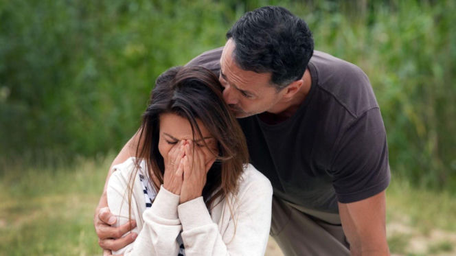 Katarzyna Glinka jako Kasia Górka i Rafał Cieszyński jako Mariusz Karpiuk w serialu "Barwy szczęścia". Mariusz pociesza zapłakaną Kasię, która zakrywa twarz rękoma. Scena z odcinka 3371, w którym para wraca do Brzezin i dowiaduje się o wypadku. Więcej o ich losach na Super Seriale.