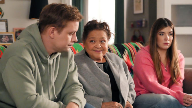 Trzy osoby, młody mężczyzna w zielonej bluzie, starsza kobieta w szarym płaszczu i młoda kobieta w różowej bluzie, siedzą na kanapie, zmartwieni sytuacją związaną z domem Pyrków. Scena z odcinka "Barw szczęścia", więcej na Super Seriale.