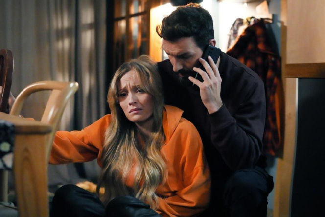 Aktorka Anna Mrozowska jako Renata siedzi na podłodze, z przerażoną miną, ubrana w pomarańczową bluzę. Za nią stoi aktor Oskar Stoczyński jako Marcin Kodur, trzymając telefon przy uchu. Scena z serialu "Barwy szczęścia" o przedawkowaniu leków. Więcej o tym odcinku przeczytasz na stronie Super Seriale.