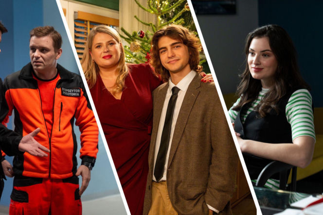 Trzy ujęcia z serialu "Barwy szczęścia": mężczyzna w stroju dyspozytora pogotowia, kobieta w czerwonej sukience i młody mężczyzna przy choince oraz młoda kobieta w zielono-białej bluzce. To sceny z nadchodzących odcinków, o których przeczytasz więcej na Super Seriale.