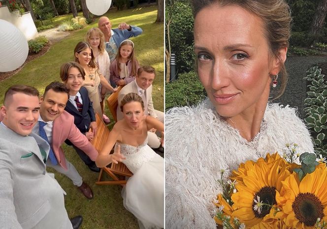 Anna Gzyra-Augustynowicz (Asia) w sukni ślubnej w otoczeniu aktorów Marka Molaka (Hubert), Natalii Zambrzyckiej (Agata), Olafa Staszkiewicza (Ignacy), Niny Szumowskiej (Marysia) i Marka Siudyma (Tolek) na planie serialu "Barwy szczęścia" oraz selfie Anny Gzyry w białym futerku, trzymającej bukiet słoneczników. Więcej o ich ślubie przeczytasz na Super Seriale.