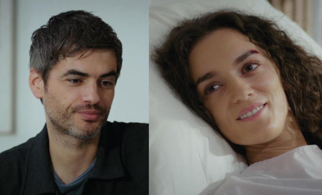 Portret Poyraza i Nany ze zbliżeniem na uśmiechniętą Nanę leżącą w szpitalnym łóżku, z raną na czole. Para z telenoweli „Dziedzictwo” po jej spotkaniu z Szakalem. Więcej o ich losach przeczytasz na Super Seriale.