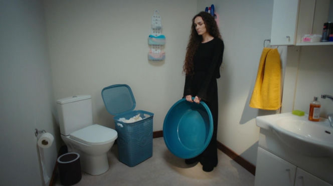 Kobieta z długimi, ciemnymi włosami w czarnej sukience, stoi w łazience z turkusową miską w rękach, obok toalety i kosza na pranie. Odzwierciedla sytuację Maryam z tureckiego serialu "Dziedzictwo", która musi wykonywać uwłaczające zadania. Więcej o losach Nany przeczytasz na Super Seriale.