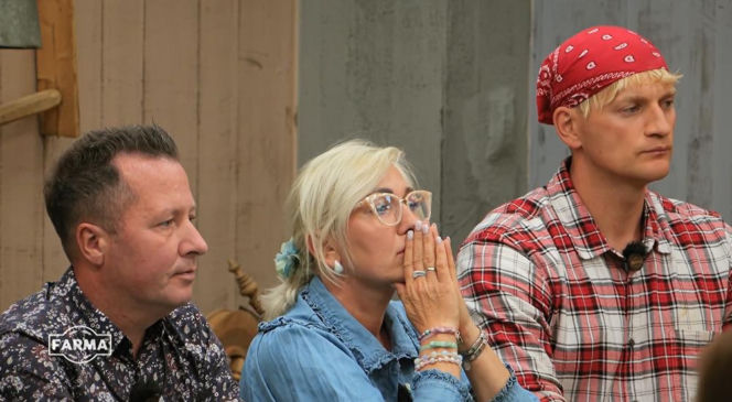 Trzech uczestników programu "Farma" – dwóch mężczyzn i kobieta – siedzi z zamyślonymi minami; kobieta w okularach i dżinsowej koszuli ma dłonie splecione pod brodą. Scena z "Farmy 5" po odejściu Janusza, wzbudzającym szok i emocje. Więcej o tym na Super Seriale.