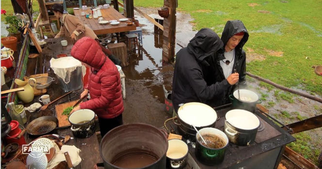 Uczestnicy programu "Farma" podczas przygotowywania posiłku na zewnątrz w czasie ulewy. Osoba w czerwonej kurtce kroi zioła, inna w czarnej kurtce miesza coś w garnku na piecu. Wokół widać kałuże i błoto. Scena z odcinka "Farma 5", gdzie Super Seriale relacjonują trudne warunki.