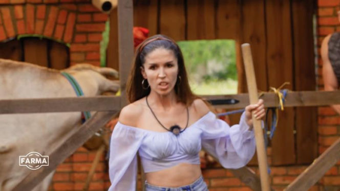 Ewa z programu "Farma" ze zmarszczonymi brwiami i otwartymi ustami, wyrażająca niezadowolenie, ubrana w błękitną bluzkę hiszpankę, trzymająca kij. Za nią widać konia i elementy stodoły. Więcej o zachowaniu Ewy i rozpadających się sojuszach przeczytasz na Super Seriale.