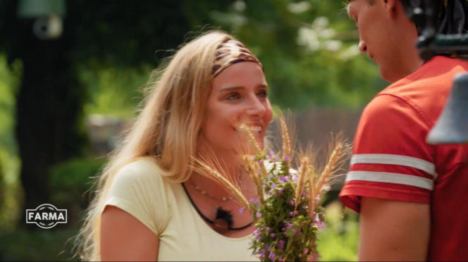 Uśmiechnięta Agnieszka z blond włosami w opasce w panterkę i żółtej koszulce trzyma bukiet polnych kwiatów, wręczony przez niewidocznego Janosika. Scena z programu "Farma", gdzie gest Janosika może mieć drugie dno. Więcej o intrygach na "Farmie" przeczytasz na Super Seriale.