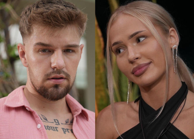 Zestawienie portretów Darka w różowej koszuli z tatuażem na klatce piersiowej i Oliwki z blond włosami w czarnej sukience, kolczykach, oboje z programu "Hotel Paradise", generuje burzę spekulacji na Super Seriale.