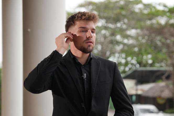 Uczestnik Darek z programu "Hotel Paradise" w czarnym garniturze z mikroportem, z ręką dotykającą ucha. Tło to rozmyta zieleń i fragmenty budynku. Zdjęcie ilustruje artykuł o kontrowersyjnym zachowaniu Darka w programie "Hotel Paradise", dostępne na stronie Super Seriale.