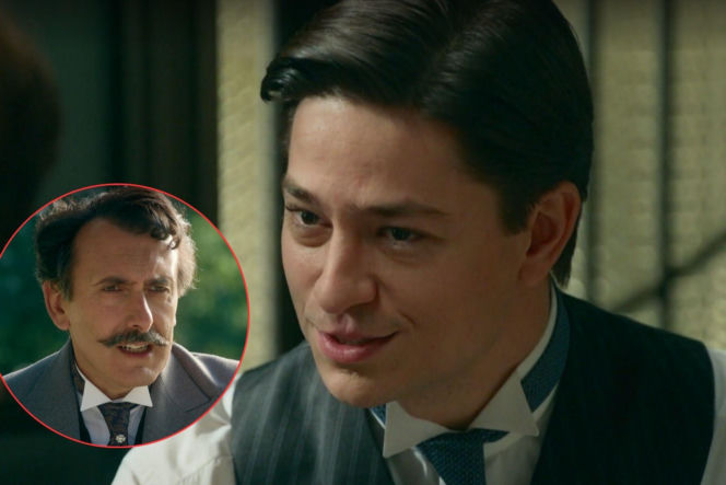 Kolaż przedstawiający Pelayo z serialu "La Promesa" w zbliżeniu na twarz oraz w tle w okręgu Cavendisha z wąsami i krawatem. Pelayo musi dostarczyć towar Cavendishowi, by uniknąć śmiertelnych gróźb. Więcej o dramatycznych losach bohaterów na Super Seriale.
