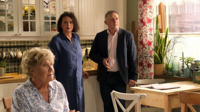 Barbara (Teresa Lipowska), Marysia (Małgorzata Pieńkowska) i Artur Rogowski (Robert Moskwa) z "M jak miłość" w kuchni. Barbara, siedząca na pierwszym planie, w jasnej bluzce w niebieskie wzory, patrzy w prawo. Marysia, w granatowej sukience koszulowej, stoi z tyłu po lewej, a Artur w marynarce, trzymając szklankę, stoi po prawej, patrząc w górę. O nadchodzącym sezonie przeczytasz na Super Seriale.