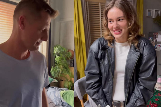 Aktorka Dominika Kachlik w czarnej ramonesce i białej bluzce uśmiecha się, patrząc na Rafała Mroczka w szarej koszulce. Artykuł na Super Seriale opisuje dalsze losy Pawła po śmierci Franki w serialu "M jak miłość".