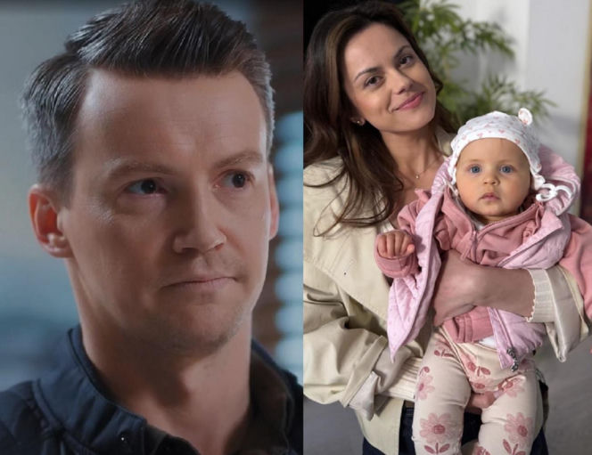 Mariusz (Mateusz Mosiewicz) trzymający śpiącą córkę Zosię, zaniepokojony patrzy na Kasię (Paulina Lasota), która stoi obok z zatroskaną miną. Scena z serialu "M jak miłość", gdzie Mariusz przerwie rozmowę Kasi i Anety o dziecku. Więcej informacji na Super Seriale.