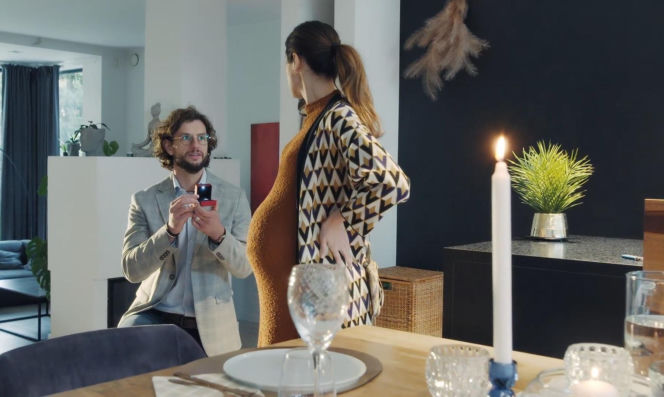 Mariusz (Mateusz Mosiewicz) klęczy przed ciężarną Kasią (Paulina Lasota) z otwartym pudełkiem z pierścionkiem, prosząc ją o rękę w serialu "M jak miłość". Tę romantyczną scenę i kulisy ich związku znajdziesz na Super Seriale.