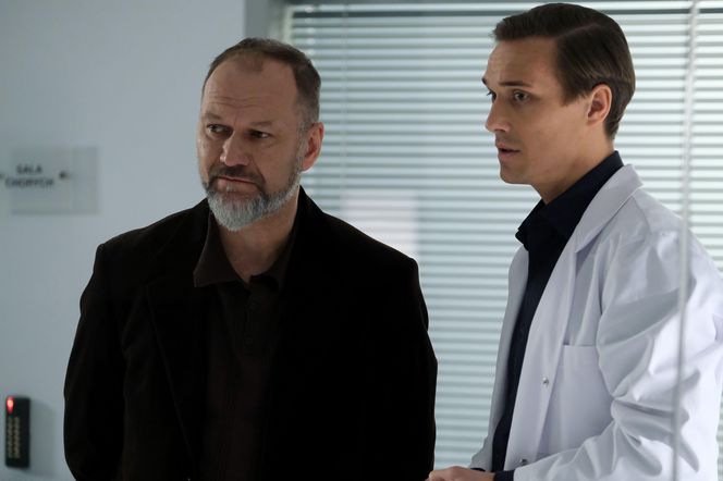 Mirosław Wójcik (Jakub Kornacki) i Olek Chodakowski (Maurycy Popiel) w scenie z serialu „M jak miłość”. Olek w białym kitlu, a Wójcik w ciemnym płaszczu stoją obok siebie w szpitalu. Więcej o dramatycznych losach bohaterów przeczytasz na Super Seriale.