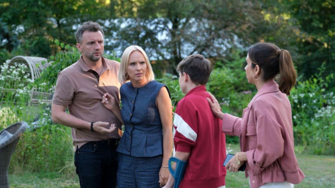 Aktorzy Arkadiusz Smoleński (Bartek), Iwona Rejzner (Dorota), Jarosław Śmigielski (Franek) i Ilona Janyst (Aneta) stoją w ogrodzie. Bartek i Dorota patrzą na Franka, który odwrócony stoi obok Anety, trzymając o kulę. Dramatyczne sceny w „M jak miłość” znajdziesz na Super Seriale.