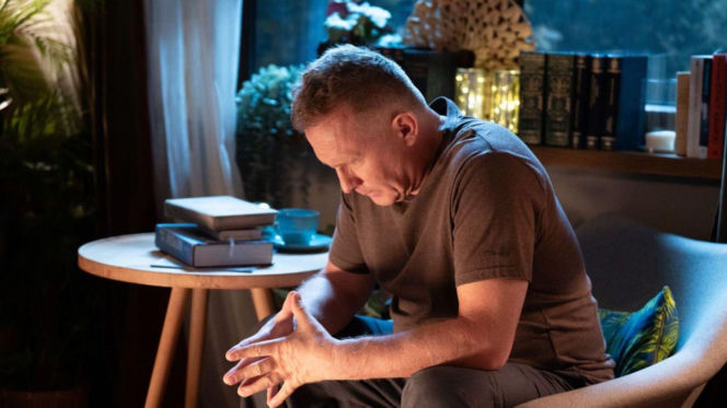 Mężczyzna, Artur (Robert Moskwa), w brązowej koszulce, z rękami splecionymi na kolanach i spuszczoną głową, siedzi w fotelu w nastrojowo oświetlonym pomieszczeniu. Wyraża głębokie zamyślenie lub smutek, co odzwierciedla kryzys w relacji z Marysią w "M jak miłość". Więcej o losach bohaterów przeczytasz na Super Seriale.