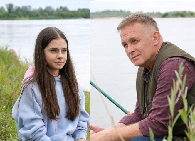 Artur Rogowski i Basia Rogowska na rybach, siedzący na składanych krzesełkach nad rzeką, w tle bujna zieleń. Artur z zatroskaną miną patrzy na córkę, która wydaje się zamyślona. Scena z serialu "M jak miłość", o której więcej dowiesz się na portalu Super Seriale.