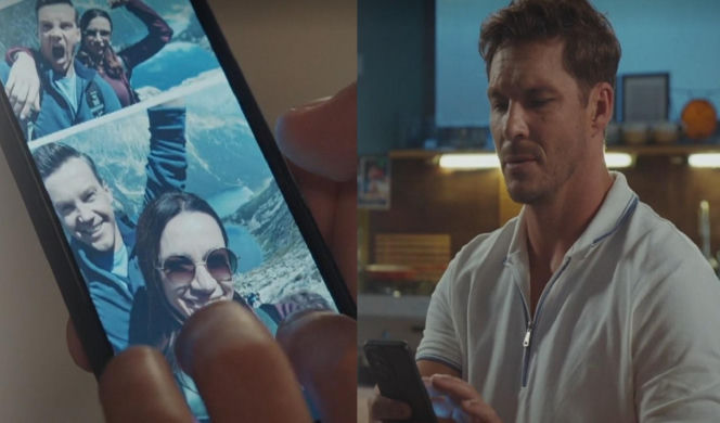 Marcin, w białej koszulce polo, zmartwiony patrzy w telefon trzymany w dłoni, gdzie wyświetlają się zdjęcia Martyny i Jakuba z wycieczki w góry, z jeziorami w tle, co wzbudza jego zazdrość. Więcej o losach bohaterów "M jak miłość" przeczytasz na stronie Super Seriale.