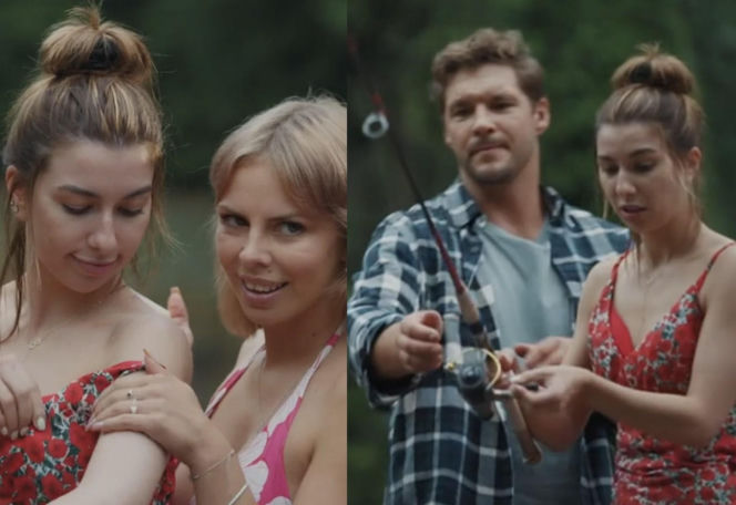 Trzy osoby: mężczyzna w koszuli w kratę i dwie kobiety, jedna w kwiecistej sukience, druga w różowym stroju. Mężczyzna trzyma wędkę, a kobieta w sukience pomaga mu z nią, co sugeruje wspólne łowienie ryb. Scena z "M jak miłość" dotycząca męskiego wypadu Marcina i Olka, o którym przeczytasz więcej na Super Seriale.