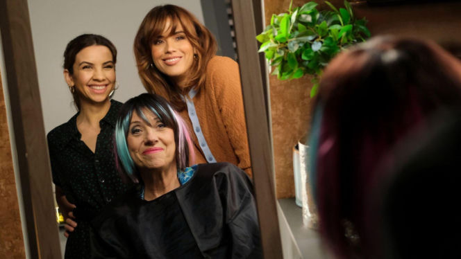 Iwona Kryńska z "M jak miłość" z awangardową, kolorową fryzurą, siedzi przed lustrem w salonie fryzjerskim. Za nią uśmiechają się Kama i Aneta, zmartwione jej metamorfozą. Scena odzwierciedla dramatyczne wydarzenia z serialu dostępne na Super Seriale.