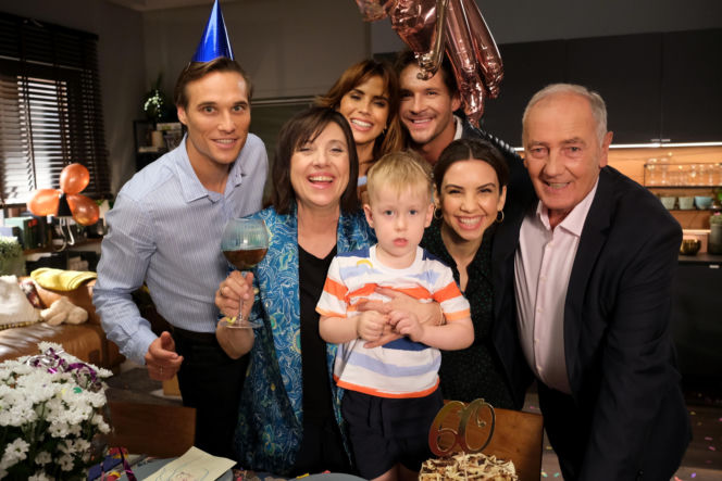 Uśmiechnięta Hanna Śleszyńska (Iwona) w turkusowej narzutce z kieliszkiem wina, Maurycy Popiel (Olek) w niebieskim kapeluszu i Ilona Janyst (Aneta) trzymająca Tymona Szkopka (Borysek), Michalina Sosna (Kama) z Mikołajem Roznerskim (Marcin), oraz Karol Strasburger (Jerzy) uśmiechają się na urodzinach Iwony w M jak miłość. Więcej o tym na Super Seriale.
