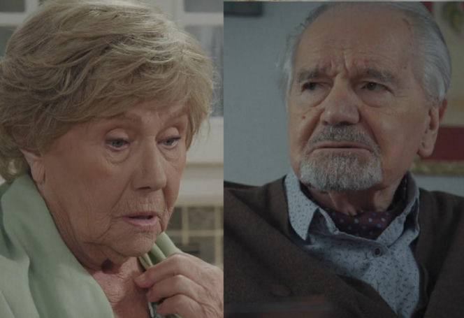 Barbara Mostowiakowa i Karol Kosowski z serialu "M jak miłość". Barbara w zielonej chustce patrzy w dół z zamyśleniem. Karol z brodą, w brązowym kardiganie i koszuli, ma poważny wyraz twarzy. Więcej o ich losach na Super Seriale.