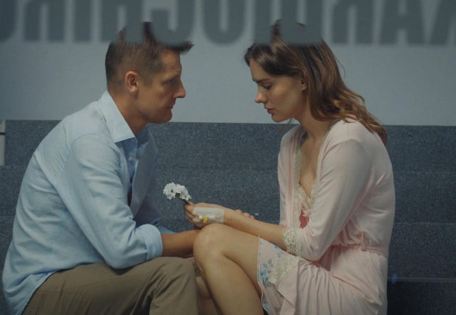 Paweł (Rafał Mroczek) w jasnoniebieskiej koszuli i beżowych spodniach, siedzi naprzeciwko Franki (Dominika Kachlik) w różowym szlafroku z koronką, z wkłuciem wenflonowym na dłoni. W tle szare, kamienne schody. Paweł ofiarowuje Frankce białe kwiaty, oboje spoglądają na bukiecik, odzwierciedlając romantyczny, choć pełen obaw moment opisywany na portalu Super Seriale.