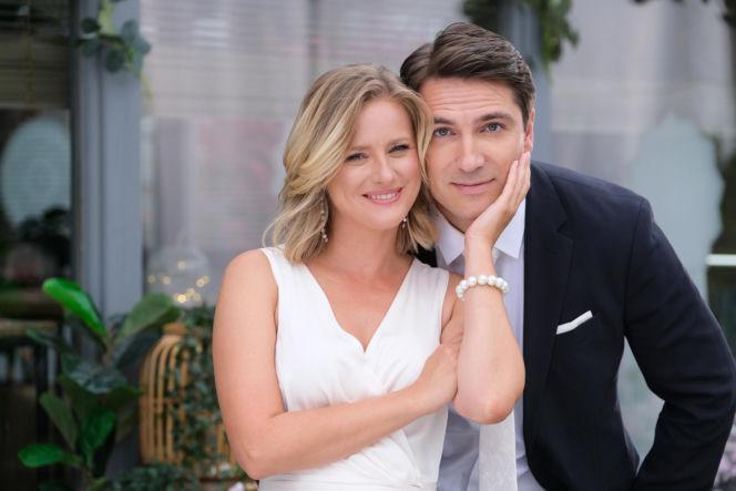 Uśmiechnięta Marta Chodorowska (Julia) w białej sukni ślubnej i Michaił Pszeniczny (Dima) w ciemnym garniturze, stojący obok siebie, pozują na tle delikatnie udekorowanego wnętrza, co zapowiada ich ślub w "M jak miłość". Więcej o losach pary na Super Seriale.