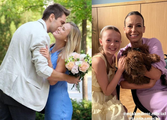 Para młoda, Julia (Marta Chodorowska) i Dima (Michaił Pszeniczny), w objęciach z bukietem kwiatów oraz Magda (Anna Mucha) z Nadią (Mira Fareniuk) i psem, uśmiechnięte do zdjęcia. Wszystkie postacie pochodzą z serialu "M jak miłość". Więcej o losach bohaterów przeczytasz na portalu Super Seriale.