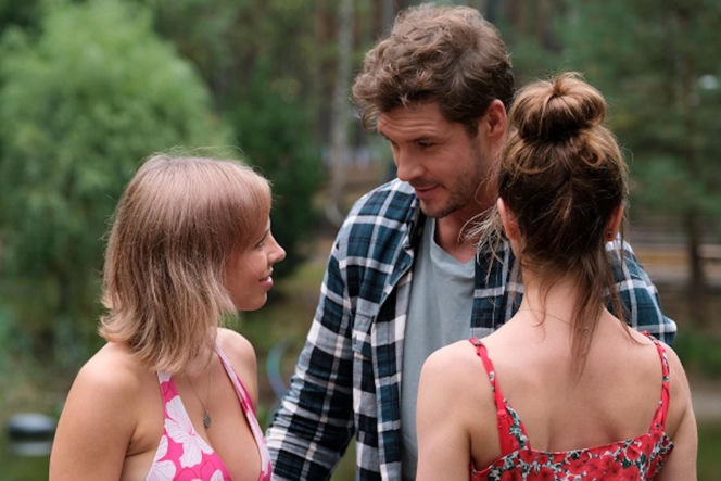 Marcin Chodakowski (Mikołaj Roznerski) rozmawia z dwiema młodymi kobietami, z których jedna nosi różowy strój kąpielowy, a druga czerwoną sukienkę w kwiaty. Mężczyzna jest w kraciastej koszuli. Zdjęcie ilustruje scenę flirtu w 1904 odcinku "M jak miłość". Więcej o serialu przeczytasz na portalu Super Seriale.