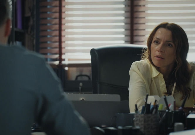 Martyna (Magdalena Turczeniewicz) w żółtej koszuli, z zaniepokojoną miną, siedzi za biurkiem naprzeciwko Jakuba (Krzysztof Kwiatkowski) i rozmawia z nim. Ich relacje w odcinku 1904 "M jak miłość" są napięte. Więcej o tym na Super Seriale.
