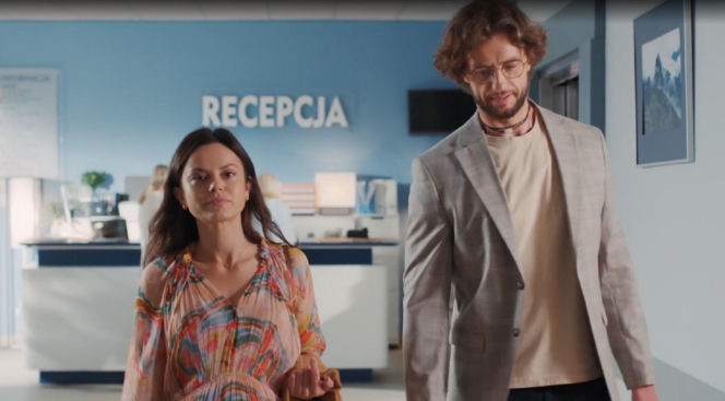 Kasia (Paulina Lasota) w kolorowej sukience i Mariusz (Mateusz Mosiewicz) w beżowym t-shircie i marynarce idą korytarzem kliniki, za recepcją. Mariusz kontroluje Kasię, co jest tematem artykułu o serialu "M jak miłość" na Super Seriale.