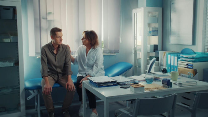 Paweł Zduński siedzi na kozetce, a obok niego Marysia Rogowska, która kładzie mu dłoń na ramieniu, pocieszając go. Scena rozgrywa się w gabinecie lekarskim, gdzie Paweł dzieli się z matką trudnymi informacjami o chorobie Franki. Więcej na Super Seriale.