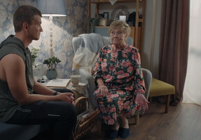Rafał Kowalski (Mateusz) siedzi na wprost Teresy Lipowskiej (Barbara Mostowiak) w jej salonie, patrząc w bok z lekkim uśmiechem. Barbara w kwiecistej sukience siedzi na fotelu, spoglądając na wnuka. Oboje są w swobodnej pozycji, a obok nich znajduje się stolik z książką i filiżanką. Więcej o ich losach w "M jak miłość" przeczytasz na Super Seriale.