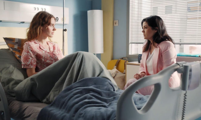 Dominika Kachlik jako Franka w szpitalnym łóżku, ubrana w piżamę, rozmawia z Katarzyną Cichopek jako Kingą, która siedzi obok w różowym garniturze. Scena z serialu "M jak miłość" oddaje emocje związane ze złymi przeczuciami Franki przed operacją tętniaka. Dwie bohaterki w szpitalnej sali z niepokojem patrzą na siebie. Więcej o ich losach przeczytasz na Super Seriale.