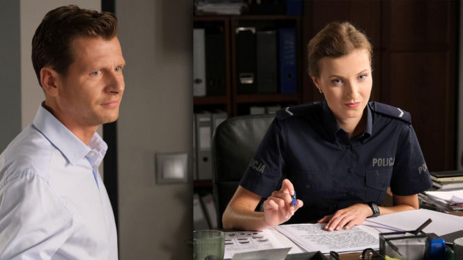 Adam Karski i Natalka Mostowiak z "M jak miłość". Karski, mężczyzna w jasnej koszuli, patrzy w prawo, a Natalia, policjantka w mundurze, siedzi za biurkiem, trzymając długopis. Więcej o ich losach na stronie Super Seriale.