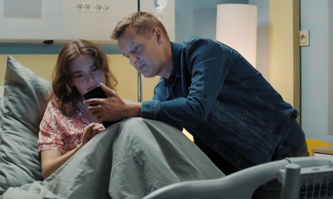 Paweł (Rafał Mroczek) w dżinsowej kurtce, pochylony nad leżącą w szpitalnym łóżku Franką (Dominika Kachlik) w piżamie, razem oglądają coś na telefonie komórkowym, co ma ją pocieszyć przed operacją. Więcej o ich losach na Super Seriale.