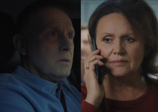 Podzielony obraz z Robertem Moskwą jako Arturem Rogowskim, wyrażającym szok, w samochodzie po lewej, oraz Małgorzatą Pieńkowską jako Marysią Rogowską, rozmawiającą przez telefon z zatroskaną miną, po prawej. Scena przedstawia dramatyczny telefon Marysi do Artura w serialu "M jak miłość". Więcej informacji o serialach znajdziesz na Super Seriale.