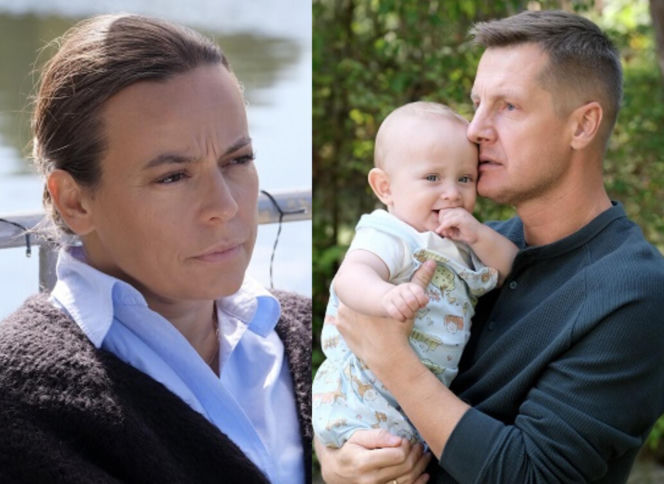 Kolaż zdjęć przedstawiający Magdę Budzyńską (Anna Mucha) z zamyśloną miną i Pawła Zduńskiego (Rafał Mroczek) trzymającego dziecko, będący zapowiedzią dramatycznych wydarzeń w serialu "M jak miłość". Więcej o losach bohaterów przeczytasz na stronie Super Seriale.