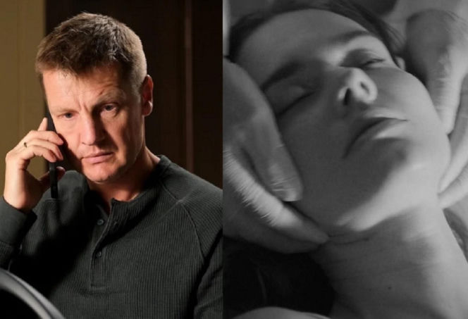 Paweł Zduński (Rafał Mroczek) rozmawia przez telefon z zatroskaną miną, a obok, na czarno-białym zdjęciu, widzimy twarz Franki (Dominika Kachlik) z zamkniętymi oczami, którą ktoś delikatnie trzyma za podbródek. Więcej o dramatycznych losach bohaterów serialu M jak miłość przeczytasz na Super Seriale.