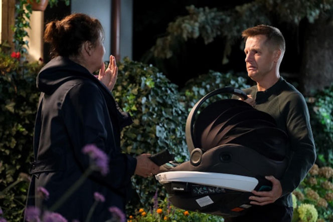 Paweł Zduński (Rafał Mroczek) w nocnej scenerii przekazuje Marysi Rogowskiej (Małgorzata Pieńkowska) nosidełko z Antosiem. Na twarzy Pawła widać smutek i łzy, natomiast Marysia ma wyciągniętą dłoń, jakby chciała go powstrzymać. Ta scena z "M jak miłość" porusza tematykę utraty i odpowiedzialności, o czym przeczytasz więcej na portalu Super Seriale.