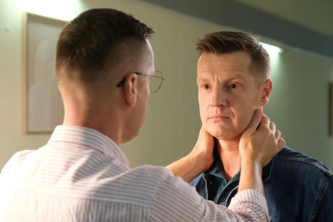 Piotrek Mroczek z M jak miłość, z okularem na uchu, patrzy na Pawła Mroczka, który ma zmartwioną minę. Piotrek trzyma dłonie na szyi Pawła, sugerując troskę lub wsparcie w obliczu trudnych wydarzeń. Więcej o ich losach na portalu Super Seriale.