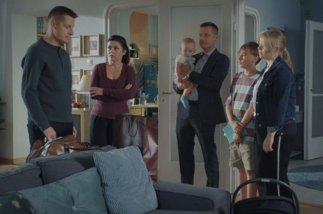 Paweł Zduński stoi w salonie z torbą podróżną, obok niego Kinga z założonymi rękami. W drzwiach stoi Piotrek Mroczek trzymający na rękach niemowlę, a obok niego dzieci: Lenka i Misiek. Cała scena dotyczy emocjonalnego momentu w serialu, opisanego na Super Seriale.