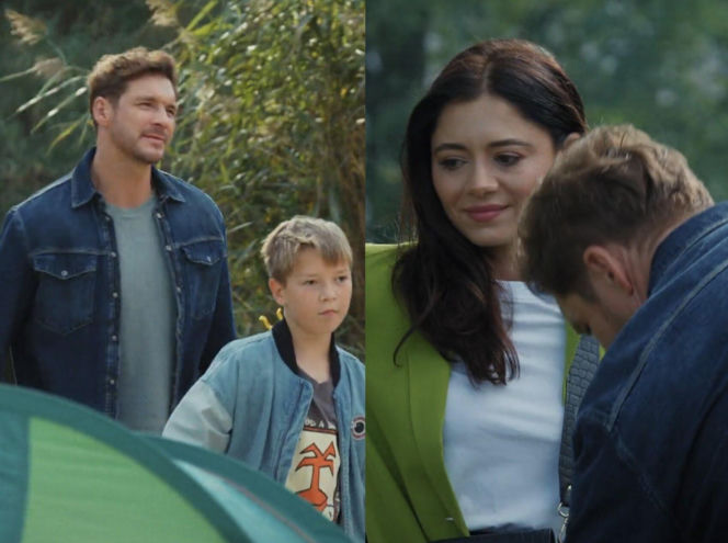 Marcin Chodakowski (Mikołaj Roznerski) i Szymek (Staś Szczypiński) stoją obok namiotu. Z prawej strony Adriana Kalska, czyli Iza, uśmiecha się, patrząc na Marcina. Widać, że była żona spieszy na ratunek. Więcej o akcji Izy w M jak miłość w serwisie Super Seriale.