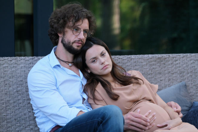 Paulina Lasota jako Kasia, opierająca głowę na ramieniu Mateusza Mosiewicza w roli Mariusza, delikatnie obejmującego jej ciążowy brzuch. Zdjęcie ilustruje scenę z serialu "M jak miłość", gdzie Kasia zmaga się z kłamstwami. Więcej o tym na stronie Super Seriale.